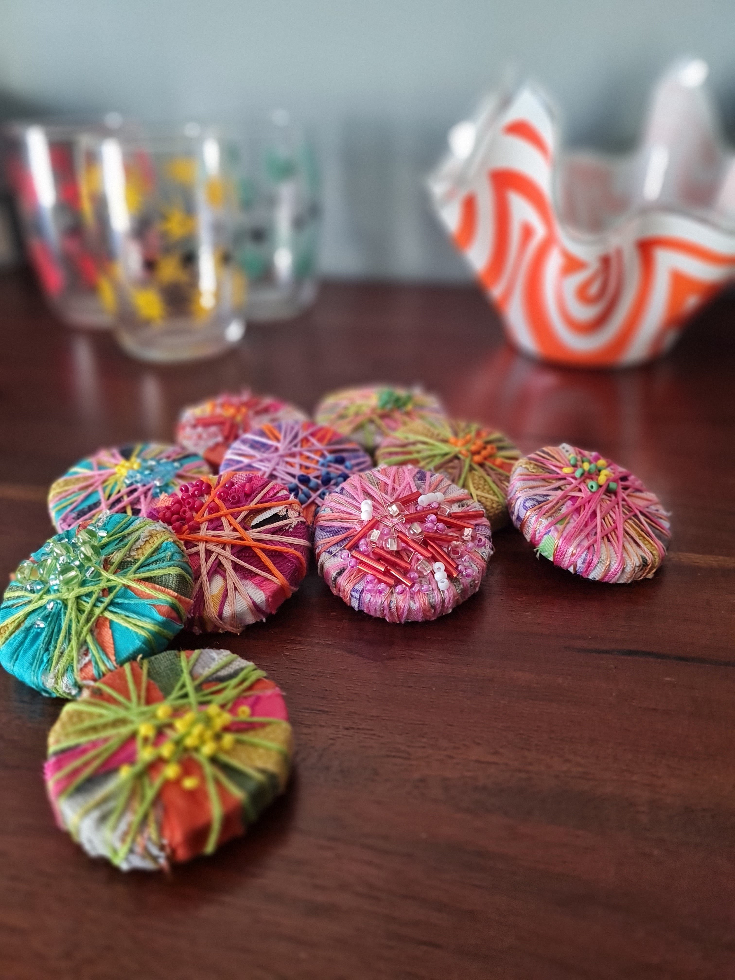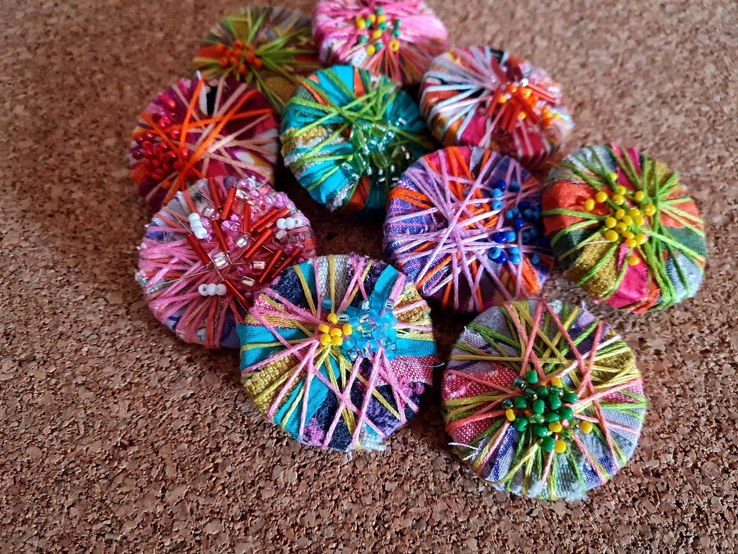 I'm having a short break from painting to work with fabric, thread, beads, and colour. It almost felt like an urgent need that made me drop everything, and pull out my big bag of cotton fabric scraps, and boxes of embroidery threads to make something tactile and joyful. Once I’ve decided how to finish them they’ll be brooches.