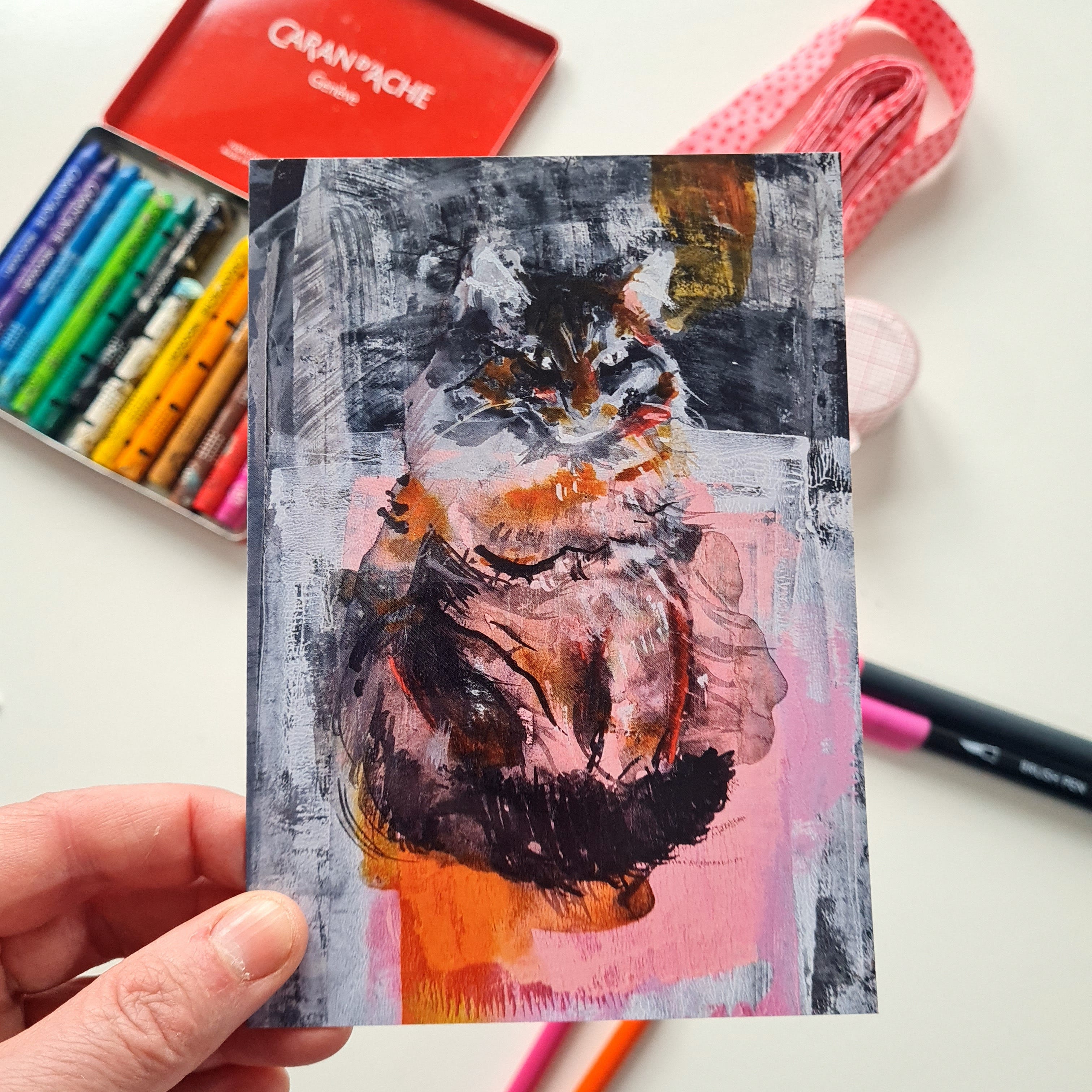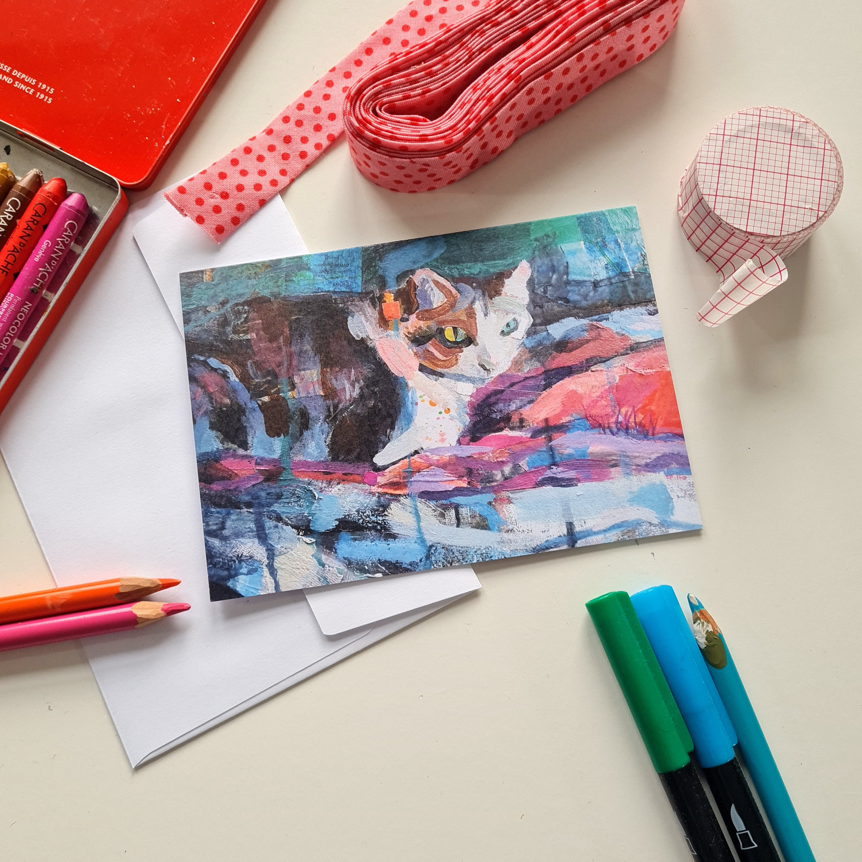 These cat art greeting cards are available from my shop now. They’re professionally printed from my paintings Marco, in the Evening Light (above) and Cat on a Mat Too (below)