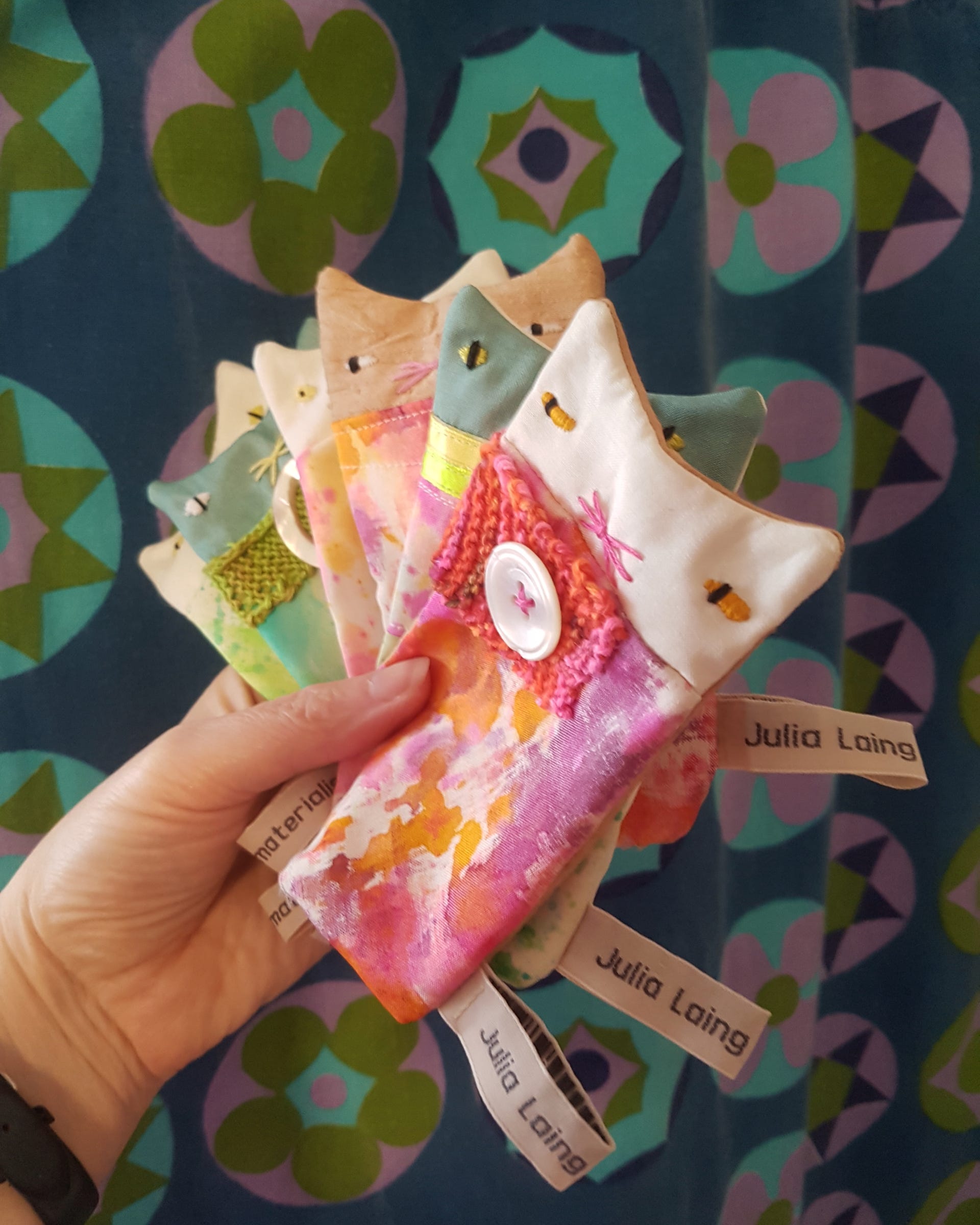 Short and sweet this week - I want to show you my work in progress. A couple of kitten dolls found new homes last week, which is always wonderful! Since I still have stuffing I decided to replace them and make a few more. These will be the last ones I make this year. So they're all cut out, embellished and sewn - they're just a bit flat. Next job stuffing and then photography for the shop update on Tuesday evening. I had fun with this lot. They're made from silk - some of it hand painted, and they've been embellished with hand knitting or embroidery and mother of pearl buttons. I’m excited to see how they're going to look.
