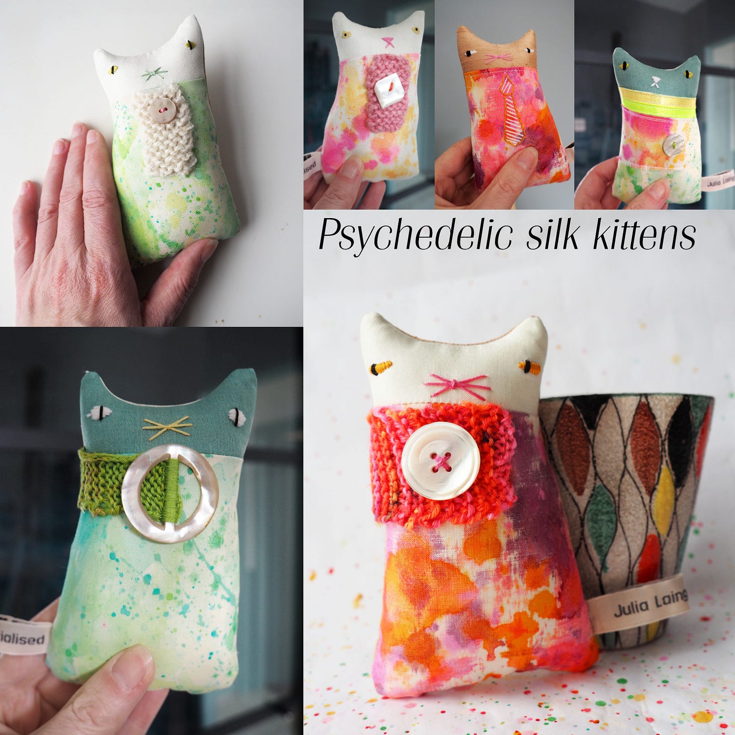 These are the finished kittens from last time. Although I’ve made many before using the same pattern, I’m particularly pleased with this group. They had a lot more time spent on them - it’s hard to calculate exactly because each individual one is not made in a linear process…it’s a bit of painting here, a bit of sewing there but my best estimate is a couple of hours work for each when you factor in painting the fabrics, knitting and stitching their fancy collars, picking out their mother of pearl buttons and sewing their eyes and whiskers, not to mention sewing, stuffing them and then hand-stitching their wee bottoms closed with the tiniest of hand stitches! I wouldn’t go to that bother unless I loved it. I love that they are completely unique and I try very hard to make them the best quality I’m capable of.